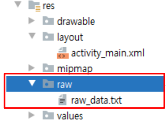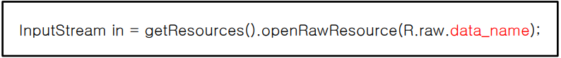 작성된 파일을 패키지에 포함시키는 방법은 Resource 클래스의 openRawResource() 메서드를 호출, 매개변수로 파일명대신 리소스 ID를 지정하여 이용한다.