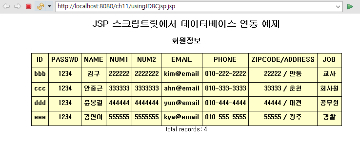 스크립트릿으로 데이터베이스 연동 예제 실행화면