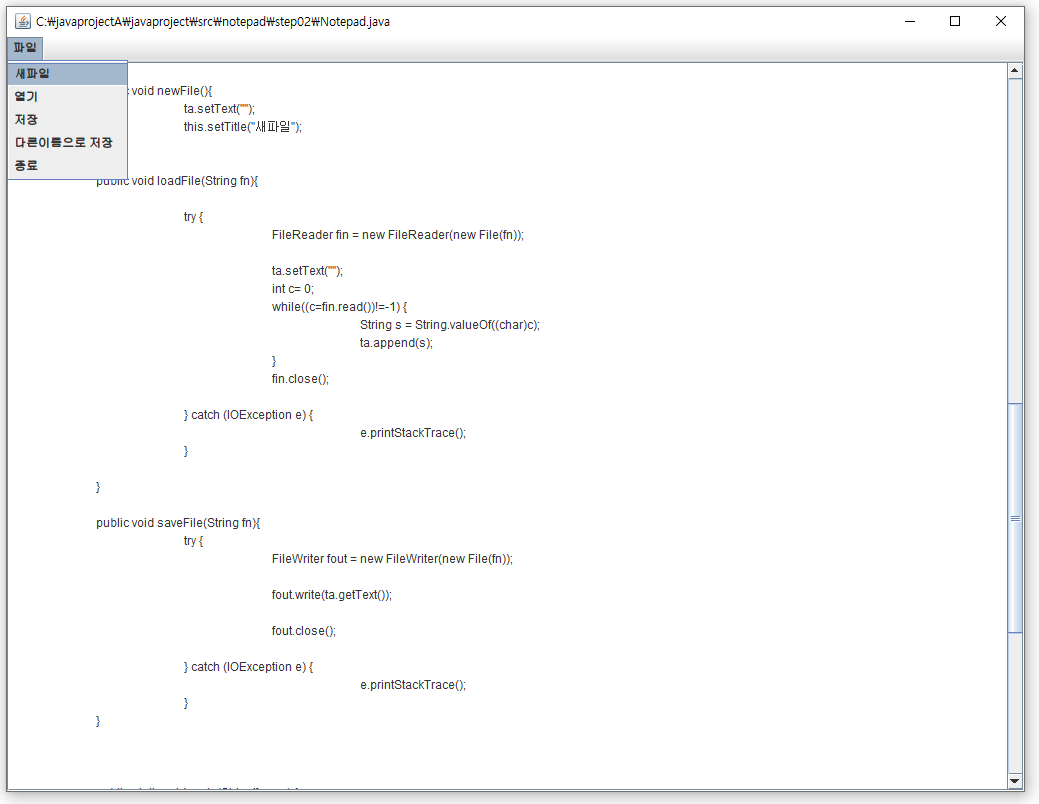 Notepad.java에 loadFile메서드와 saveFile메서드를 추가했다. 여러 가지 방법이 있겠지만 간단하게 FileReader와 FileWriter로 기능을 만들었다. 메서드의 매개변수로는 파일의 path를 가져온다.