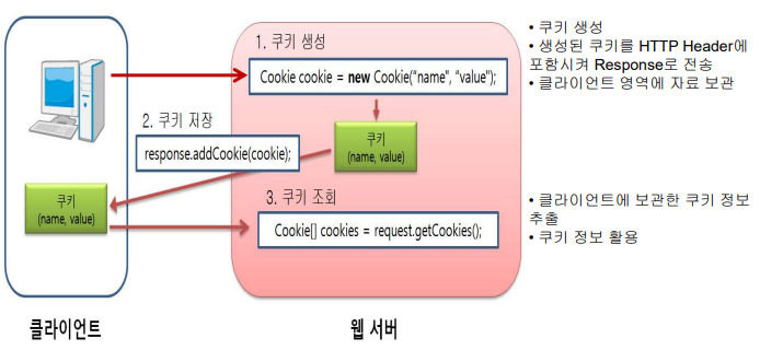 쿠키는 서버에서 생성하고 서버에서 클라이언트의 브라우저로 전송되어 클라이언트의 컴퓨터에 저장된다. 저장된 쿠키는 다시 해당하는 웹페이지에 접속 할 때, 요청정보에 실려 클라이언트에서 서버로 전송된다. 서버는 쿠키를 읽어서 클라이언트를 분별한다.