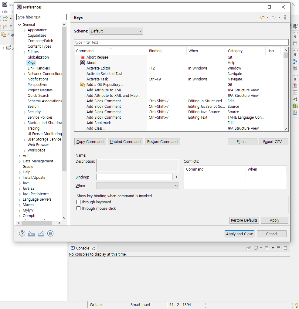 상단 메뉴바 Window-Preferences-General-Keys 이클립스의 단축키를 확인하거나 설정할 수 있다.